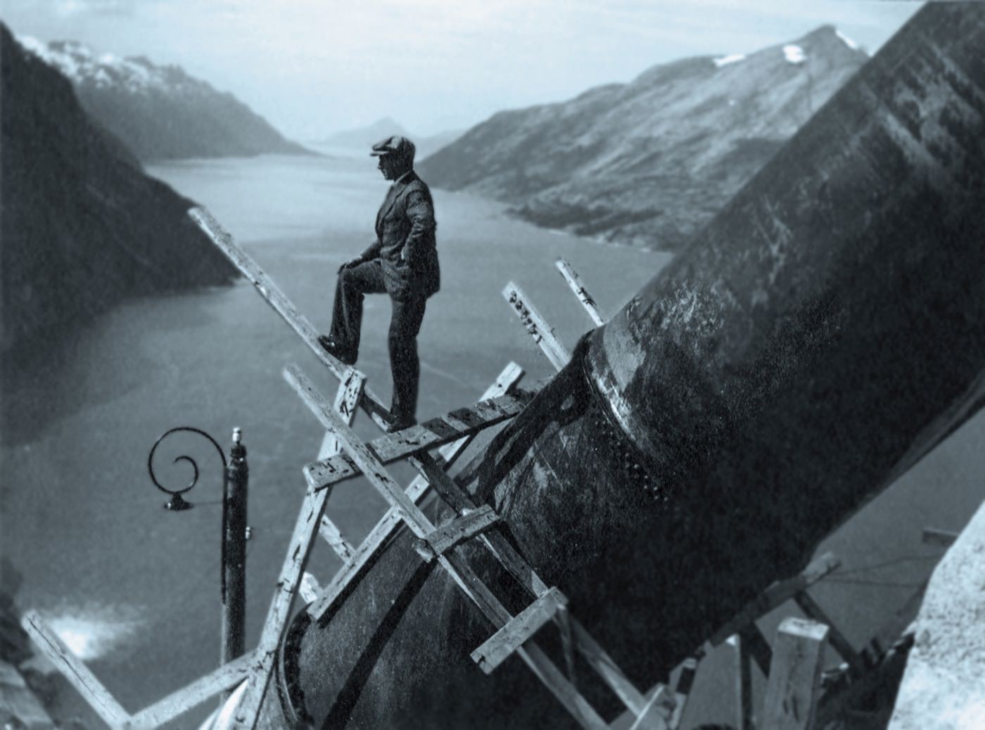 Operations Manager Bernt Lund gazes over Glomfjord fjord during an inspection of a pipe trench in 1918.