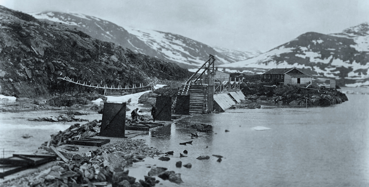 A mobile crane is installed during dam construction on Vetlevann in Tyssedal in 1907.