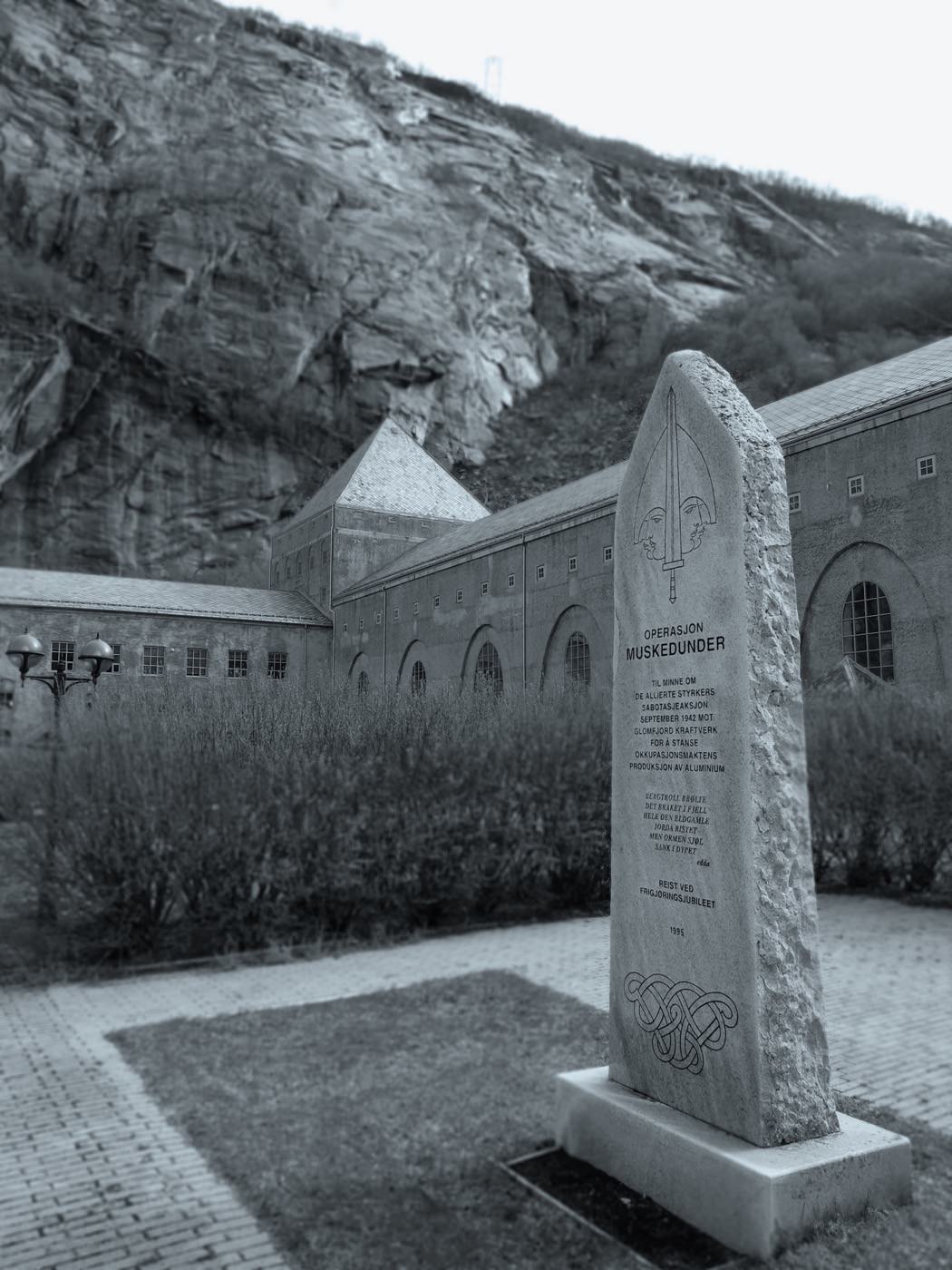 A monument stands outside Glomfjord power plant in memory of the saboteurs' heroic efforts. The names of the saboteurs are carved in stone on a pillar outside the Glomfjord power plant.